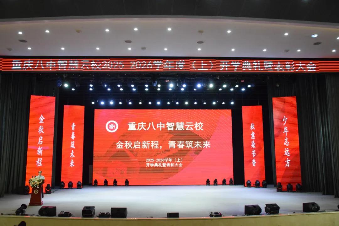 2025年9月2日,重庆八中智慧云校“金秋启新程,青春筑未来”2025-2026学年(上)开学典礼暨表彰大会,在八中渝北校区大礼堂举行,重庆八中教育集团校长助理、八中渝北校区副校长、智慧云校校长周明出席会议,重庆八中智慧云校全体学子共计约5万人,同步在线上参会。